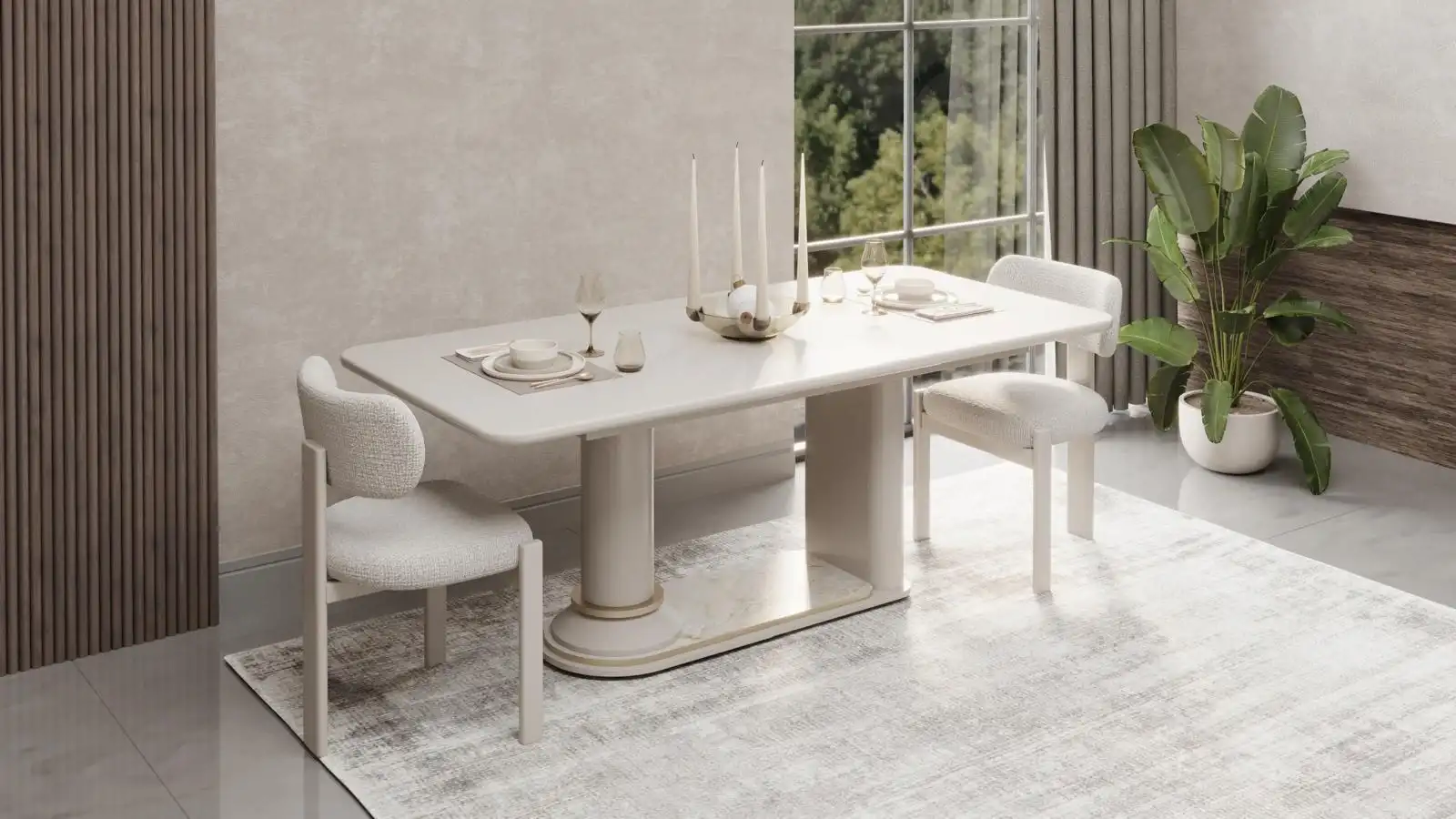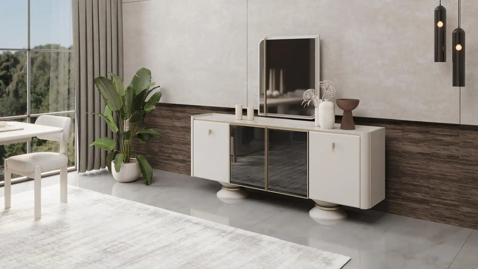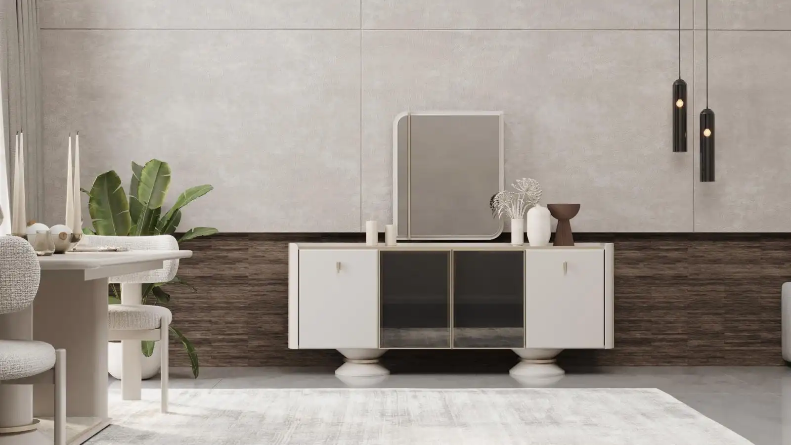 Takımın şık masası, geniş yüzeyi ile konforlu bir kullanım sağlarken; ergonomik tasarımlı sandalyeler uzun süreli oturumlarda yüksek rahatlık sunar. Konsol ve konsol aynası ise depolama alanı ve dekoratif bütünlük açısından takımı tamamlar.