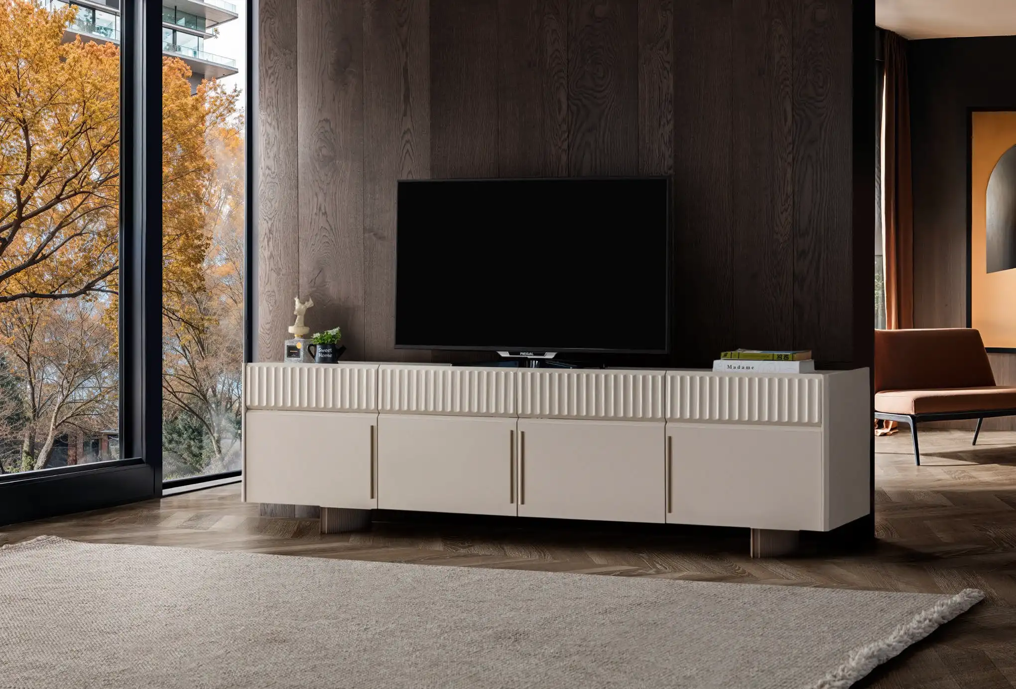 Modern çizgileri ve doğal dokulu yüzeyiyle öne çıkan Sarıyer TV Ünitesi, salon ve oturma odalarında şık ve kullanışlı bir alan oluşturur. Fonksiyonel depolama alanları, raf düzeni ve geniş TV paneli sayesinde hem dekoratif hem de pratik bir kullanım sunar.